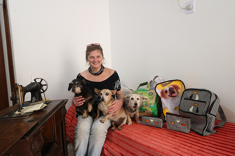 Foi comprando a ração para os três “filhos de pelo”, Nina Tamborzinho, Otti e a pequena Suzi, que a professora de inglês Monica Inês Schuck pensou em confeccionar mochilas e sacolas. Ao perceber o excesso de plástico que ia fora quando acabava cada saco de 50 quilos de ração, ela imaginou que poderia fazer alguma coisa de útil na pandemia. Testou formas e moldes, e descobriu um talento extra: criar sacolas ecológicas, estojos e bolsas usando como base o plástico que era descartado.