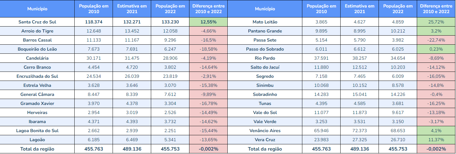 Os primeiros resultados do Censo 2022 do Instituto Brasileiro de Geografia e Estatística (IBGE) foram divulgados na manhã desta quarta-feira, 28. Um dado curioso chama a atenção: os 28 municípios que compõem a região do Vale do Rio Pardo e Centro-Serra, que no último levantamento, em 2010, somavam 455.763 habitantes, agora contam com 455.753 pessoas. Isto é: exatamente dez a menos, ou uma variação de -0,002%.