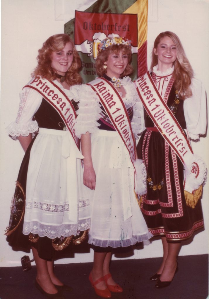 Christiane Bublitz, hoje com 56 anos, tinha apenas 17 quando foi escolhida para representar a 1ª Oktoberfest. Recorda que alguns dias depois de receber o título completou 18 anos. “Foi uma oportunidade que surgiu porque eu era modelo e, de vez em quando, participava de alguns concursos. Meu pai era sócio da Aliança e me chamou para participar. Como foi a primeira feira, na época não sabíamos muito como ia ser, o que era, o que iria acontecer. Então, quando eu ganhei, foi uma grande surpresa, porque havia muitas meninas lindas, conhecidas, várias que já tinham títulos. Mas foi muito bom, eu amei, aprendi muito”, relembra Christiane, por telefone, de Itajaí, em Santa Catarina, onde reside.