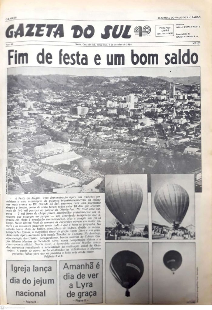 Arquivos da Gazeta do Sul mostram, em reportagem publicada no dia 9 de outubro de 1984, dois dias após o término da festa, que a estimativa é de que a 1ª Oktoberfest recebeu 140 mil pessoas. “O secretário Ademir Müller compartilha da opinião da maioria esmagadora da comunidade santa-cruzense, que se define no sentido de que a Oktoberfest passe a ser um evento anual e de afirmação turística de Santa Cruz no cenário estadual e, com o passar dos anos, até nacional”, descreve a matéria.