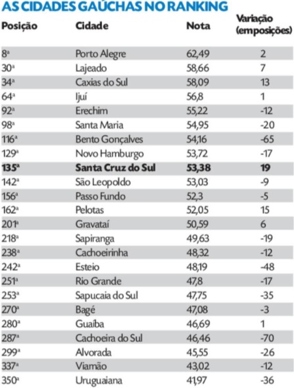 Os santa-cruzenses tiveram desempenho considerado expressivo pelo CLP, avançando 19 posições. É o maior resultado do Estado, que tem Porto Alegre como a melhor nota, na oitava colocação. Cachoeira do Sul foi a mais expressiva queda, baixando 70 lugares – é o 287º no Brasil.