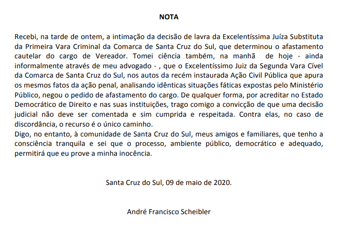 Um dia após ser afastado da Câmara de Santa Cruz por uma liminar, o vereador André Scheibler (PSD) divulgou nota na qual afirma que tem a “consciência tranquila” e que vai provar a sua inocência.