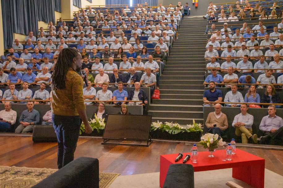 Tinga falou para aproximadamente 300 pessoas entre colaboradores do setor administrativo e também com agentes de atuação nas lavouras, como os orientadores agrícolas, supervisores e coordenadores. O título da palestra apresentada pelo ex-atleta é “Gestão além da planilha”, uma alusão ao papel essencial da gestão de pessoas nas empresas além dos números.