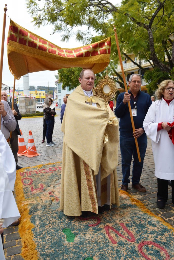 A procissão foi realizada durante à tarde, reunindo grande público que acompanhou o deslocamento do entorno da Praça 3 de Dezembro em direção à Igreja Matriz. “Somente neste dia se sai da Igreja com o Santíssimo Sacramento e se faz a procissão sobre o tapete, os enfeites, e se dá a bênção à cidade, as empresas, às famílias, comunidades. Um sentido muito bonito”, reforça o padre Gelso Bernardy.