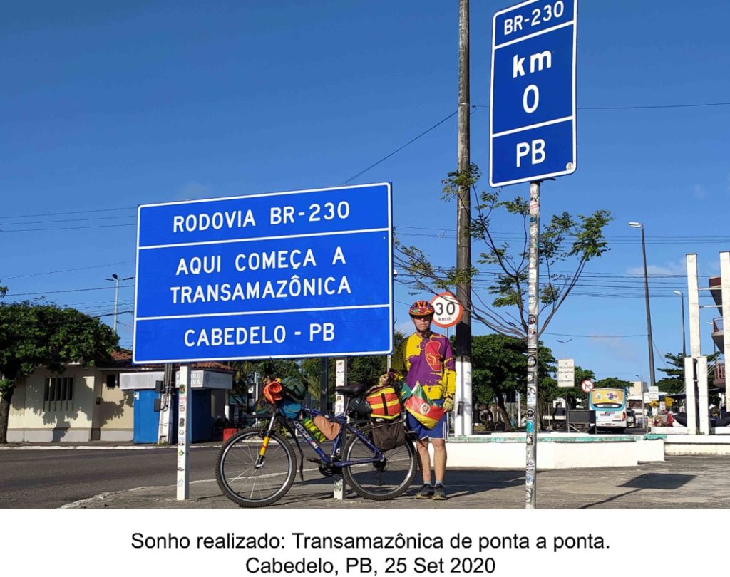 Dia 25 de setembro de 2020, às 11 horas, cheguei a Cabedelo (PB), para a tradicional foto junto à placa do Km 0: “Rodovia BR-230 – Aqui começa a Transamazônica”. Assim, eu realizava o velho sonho de percorrer de bicicleta, de ponta a ponta, essa mítica rodovia, mas tão pouco conhecida. Nela percorri 4.433 quilômetros, 1.569 de terra, em 65 dias efetivamente pedalados, no ano passado e neste.