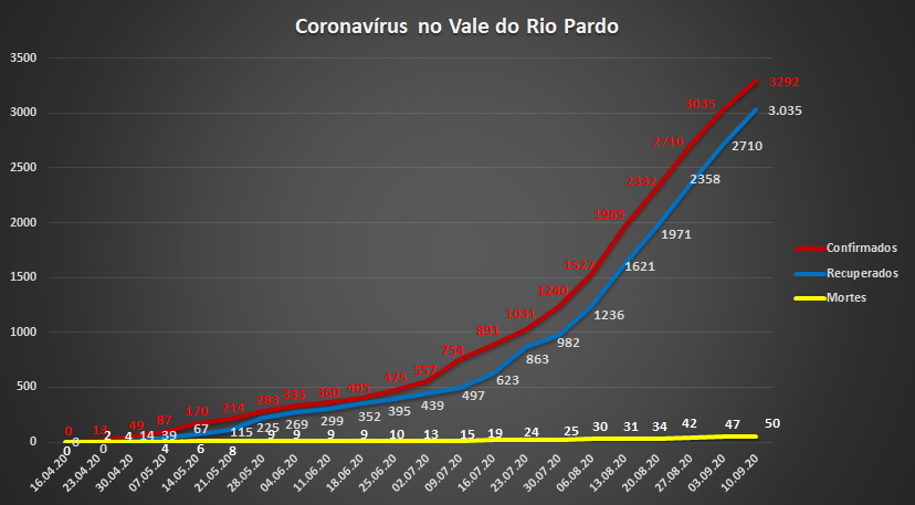 No outro extremo, está o aumento de mortes, que agora já são 50 – na semana passada, eram 47, mostrando que a crescente é lenta, mas preocupa. O número de confirmados totais já se aproxima dos 3,3 mil, ante os pouco mais de 3 mil confirmados na semana anterior. Veja os números de confirmados, recuperados e mortes abaixo.