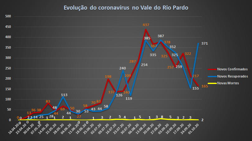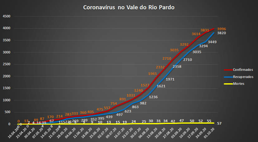 Em setembro, o Vale do Rio Pardo teve 1.099 novos casos confirmados, chegando a 3.924 no total. Esse acréscimo representa 38,9% de aumento em relação ao número anterior, que era de 2.825. A título de comparação, na análise do mês de agosto, o aumento sobre o total de casos havia sido de 105,5%.