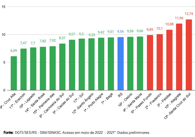 Ao todo, o Rio Grande do Sul registrou em 2021, 1.185 óbitos infantis e 124.186 nascimentos, resultando em uma taxa preliminar de 9.54 óbitos. Assim, o Estado atingiu a meta ajustada para o ano, de 9.70. Quanto à faixa etária, cerca de 74.35% do total são óbitos neonatais (0–28 dias). Aproximadamente 66.16% do total de óbitos ocorreu entre recém-nascidos com menos de 2,5 quilos ao nascer.