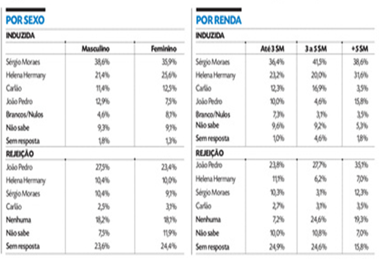 A rejeição traz empate entre Helena e Sérgio nos homens e vantagem do ex-prefeito entre as mulheres. Quanto à renda, Carlão tem a menor entre aqueles que ganham até três salários mínimos e João Pedro a maior na faixa de cinco mínimos ou mais.