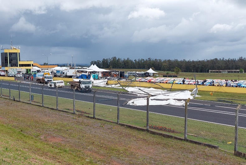 As tendas da HB20 serão remontadas na sexta-feira, 23. De acordo com o médico Leandro, o piloto Marcelo Zebra se machucou depois de pular a mureta para sair de baixo da tenda. Ele se desequilibrou e caiu. Raspou a cabeça no chão e teve um sangramento na testa. Três pessoas tiveram ferimentos leves e foram liberadas no local, continuando a trabalhar normalmente. Uma senhora que estava no local recebeu uma pancada leve no rosto e foi por conta própria ao hospital para avaliação. Zebra está confirmado nas corridas do fim de semana.