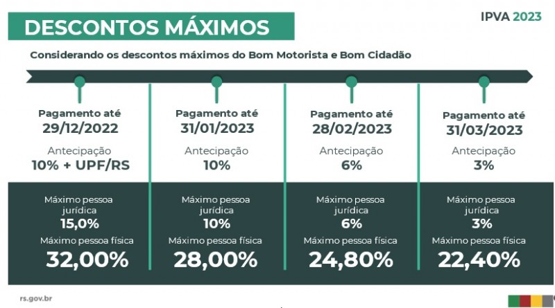 O motorista que optar pela antecipação do tributo até o dia 28 de fevereiro terá descontos que podem chegar a 24,8%. Caso a quitação ocorra em março, a redução é de até 22,4%. Os motoristas que aderiram ao parcelamento também terão descontos nas cotas de fevereiro e março – 6% e 3%, respectivamente.