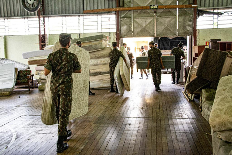 Para agilizar a entrega de móveis, eletrodomésticos, colchões e demais doações aos moradores atingidos pela chuva, o 7º Batalhão de Infantaria Blindado de Santa Cruz do Sul disponibilizou efetivo e veículos para a força-tarefa da Prefeitura. Além de três caminhões, integrou-se ao grupo de trabalho um pelotão com três sargentos, dois cabos e dezessete soldados.