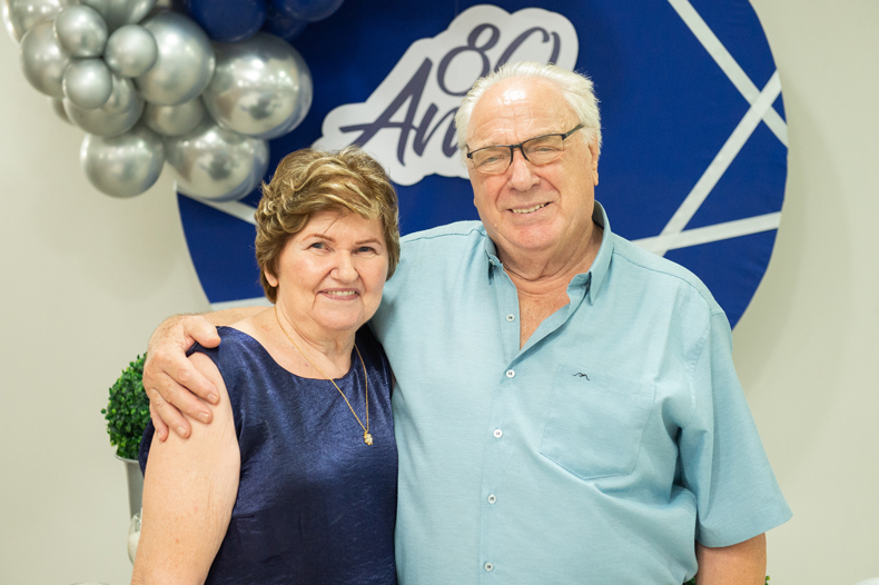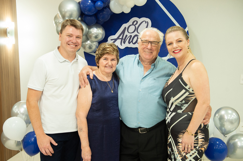 Ao lado da esposa Bernadete, Waldemar Kurtz recebeu o filho Gerson e Vivian Kurtz, os netos Matheus e Lucas Kurtz, Rodrigo Kurtz e Rosilaine Martins e demais familiares e amigos para comemoração dos seus 80 anos, na sede do Sindibancários.