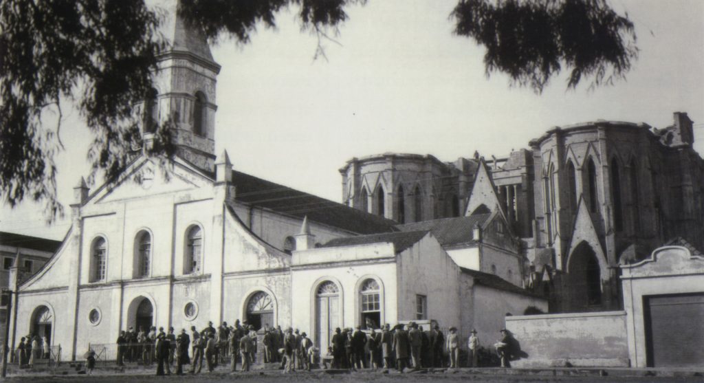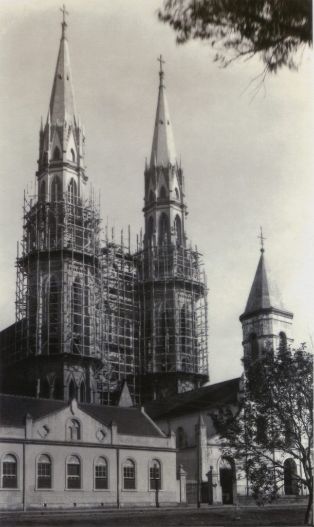 A Catedral em construção, ao fundo, tendo em primeiro plano a antiga igreja matriz de Santa Cruz