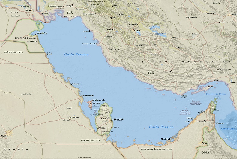 Golfo Pérsico, com o Catar ao centro, avançado para dentro da água, e a orla dos Emirados, rica em pérolas e petróleo