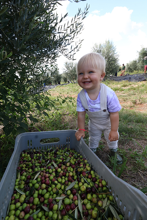 Atualmente, são cerca de 1.500 quilos de azeitonas colhidas por dia na propriedade, depois enviadas no mesmo dia para virar o azeite. A colheita se estende até o final de março. São quatro variedades de azeitona que crescem na área: Koroneiki, originada da Grécia; Picual e Arbequina, provenientes da Espanha; e Galega, de origem portuguesa.