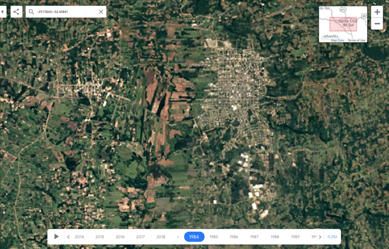 Uma nova funcionalidade do Google Earth mostra o quanto Santa Cruz do Sul e Vera Cruz cresceram nos últimos 35 anos. A timelapse é uma sequência de imagens de satélite (uma para cada ano) dispostas exatamente no mesmo ângulo que, vistas rapidamente, dão a ideia de movimento.