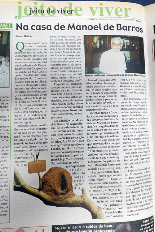 O poeta prontamente concordou em receber o jornalista vindo da região Sul para uma entrevista em sua casa. E essa experiência Beling compartilhou em texto na página 4 do suplemento de final de semana Magazine, na Gazeta do Sul de 22 e 23 de junho de 2002, sob o título “Na casa de Manoel de Barros”, ilustrada com foto do autor. “Quinze minutos para as cinco da tarde da quinta-feira, a primeira do mês de junho de 2002. Percorro apressado as cinco ou seis quadras que separam o centro comercial das imediações da Estação Rodoviária de Campo Grande, capital do Mato Grosso do Sul. As ideias fervilham. Em menos de 15 minutos deverei estar na residência do poeta Manoel de Barros”, principiava o relato.