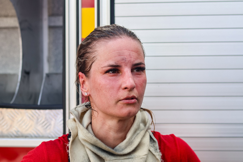 Uma mulher que estava próxima também comentou sobre a determinação da bombeira. Depois de um tempo puxando um pouco de ar, limpando o rosto superficialmente e tomando água, ela aceitou conversar com o Portal Gaz e relatar como foi parte da ação. Bombeira de Santa Cruz do Sul, a soldado Geniane Nascente de Oliveira, de 33 anos, comentou que quando a equipe chegou, o local já estava completamente tomado pelas chamas.