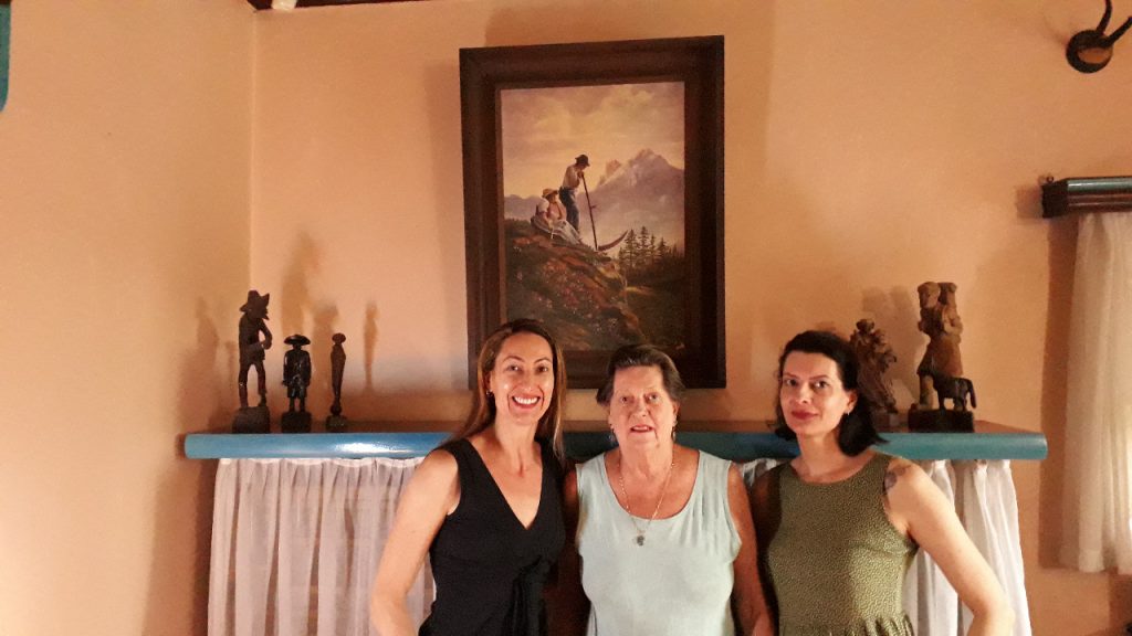 “Ele pintou também alguns quadros, mas não sei a quem pertencem e se ainda existem. Temos apenas um na família. Como essa era a fonte de renda, pintava o que podia numa cidade pequena como Santa Cruz”, conta. O quadro guardado pela família retrata um casal de camponeses ao pé de uma montanha. Roman também havia feito um curso de entalhe na Alemanha, que o ajudou a fazer peças para a casa e o ateliê. O documentário relembra ainda gravuras da terra natal feitas pelo artista e que foram enviadas por carta a familiares e amigos na Alemanha.