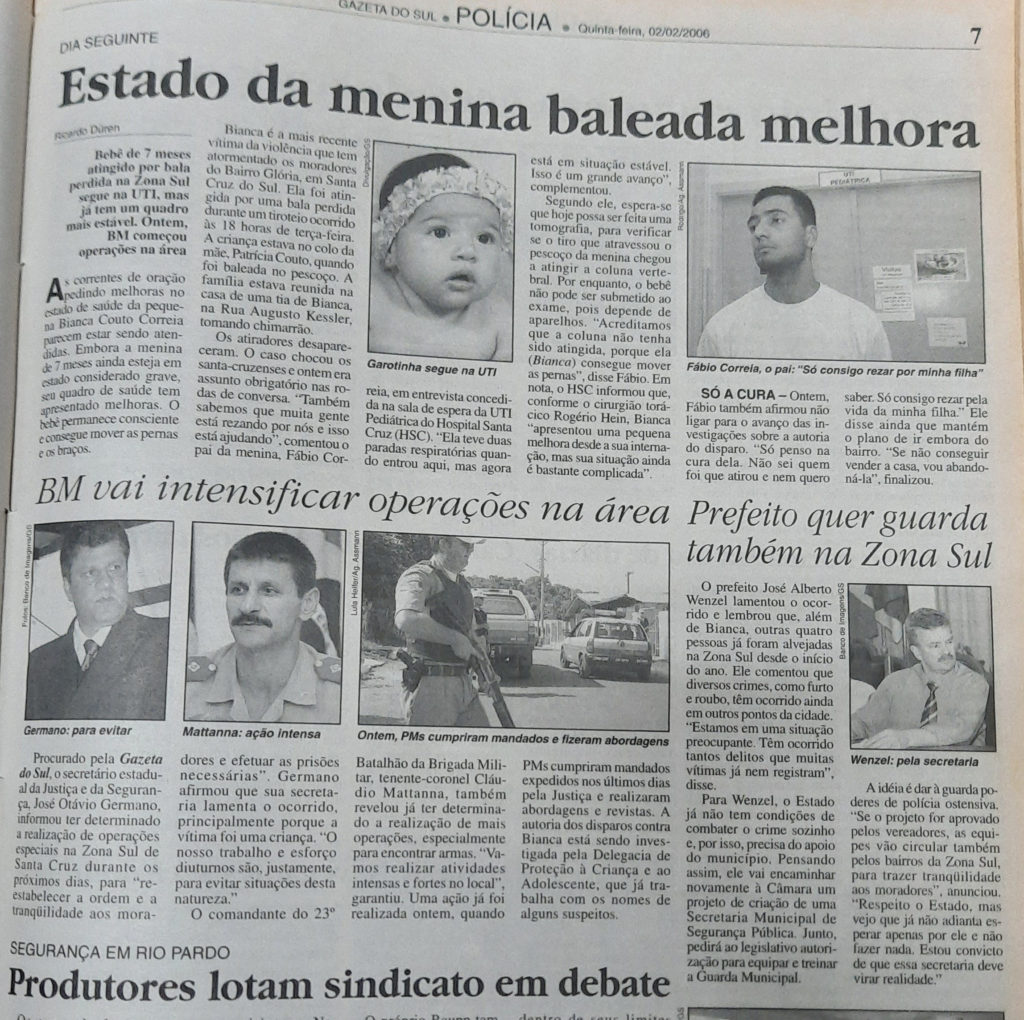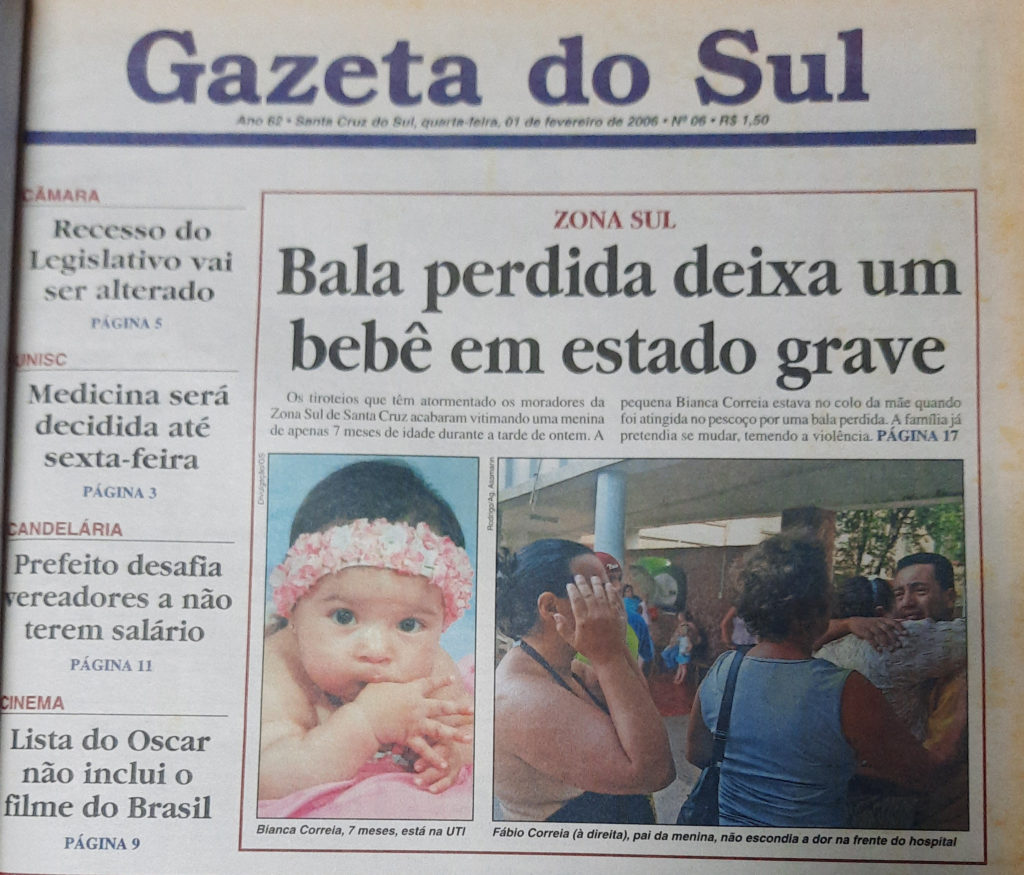 Há 15 anos, em 1º de fevereiro de 2006, Patrícia Couto Corrêa e Fábio Alexsander Corrêa viviam um drama. Aguardavam na sala de espera do Hospital Santa Cruz por um milagre. Entre a vida e a morte, a pequena filha do casal, Bianca Couto Corrêa, de 7 meses, travava uma luta pela sobrevivência após ter sido atingida no pescoço por um tiro de revólver na tarde do dia anterior, 31 de janeiro.