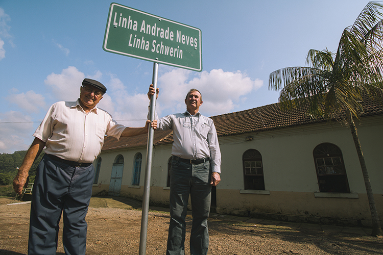 Para celebrar a pluralidade de culturas do município, na manhã do último sábado, seu Eno outros integrantes da comunidade fixaram em frente ao atual Salão Müller uma placa que indica o nome da localidade em português – Linha Andrade Neves – e como era chamada na época da colonização – Linha Schwerin.