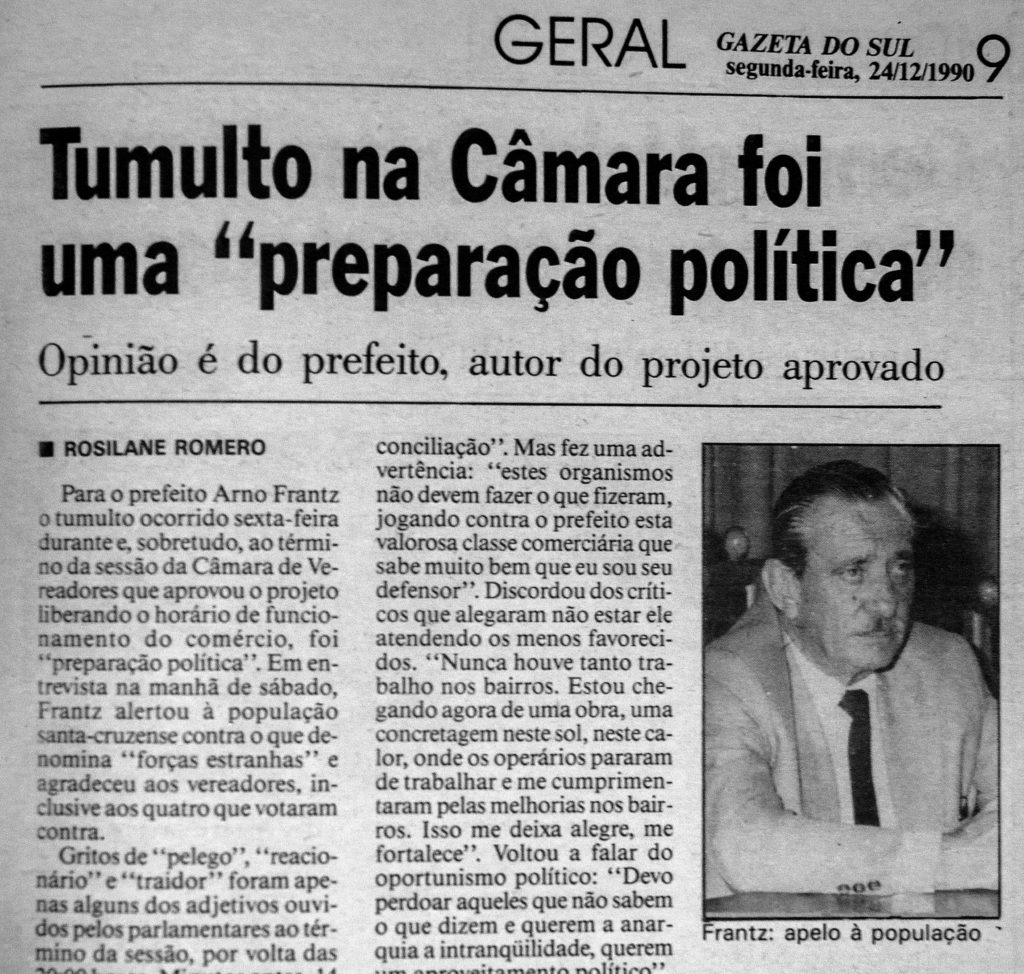 Já o segundo artigo estabelecia que a nova regra passaria a valer tão logo a lei fosse sancionada: “Esta lei entrará em vigor na data de sua publicação, revogadas as disposições em contrário.” A alteração na legislação santa-cruzense acompanhava um movimento que ocorria em vários municípios naqueles dias e costumava colocar entidades empresariais e representações de trabalhadores do comércio em forte oposição. O resultado foi um grande e ruidoso ato no dia da votação para pressionar a maioria dos vereadores disposta a apoiar a medida – que, no entanto, não conseguiu evitar a aprovação com folga.