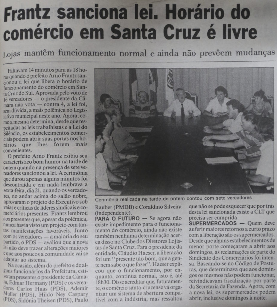 O projeto tinha poucas linhas, mas representava uma revolução para a economia local. “É livre, no Município de Santa Cruz do Sul, o horário de funcionamento dos estabelecimentos comerciais de qualquer natureza”, dizia o primeiro artigo do texto, que se transformaria na histórica lei 2.341, conhecida como Lei do Livre Horário do Comércio. Até então, vigorava uma norma de 1965 do Código de Posturas que permitia o funcionamento das lojas somente até as 18 horas no inverno e até 19h30 no verão, enquanto os supermercados podiam abrir até as 19h30, exceto em datas especiais, e eram proibidos de abrir aos domingos.