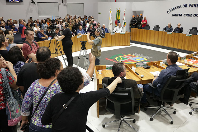 Em meados de 2009, o projeto de lei que instituiu as diretrizes para a Política Municipal de Saneamento causou imensa polêmica. Ele permitia que os serviços de abastecimento de água e tratamento de esgoto fossem geridos pela iniciativa privada, por meio de concessão pública. Grandes grupos de manifestantes ligados a entidades como o Sindiágua – que representa os servidores da Corsan – passaram a ocupar a Câmara para pressionar os vereadores contra a proposta. A votação só conseguiu ser concluída em 20 de julho daquele ano, após duas tentativas que tiveram de ser interrompidas sob alegação de falta de segurança. Do plenário, vereadores relataram ter ouvido xingamentos e até recebido moedas nas cabeças, lançadas das galerias. Para que a votação pudesse acontecer, a Brigada Militar chegou a ser chamada. A Câmara de Santa Cruz do Sul ficava à época na Rua Júlio de Castilhos, no prédio do antigo Cine Apolo.