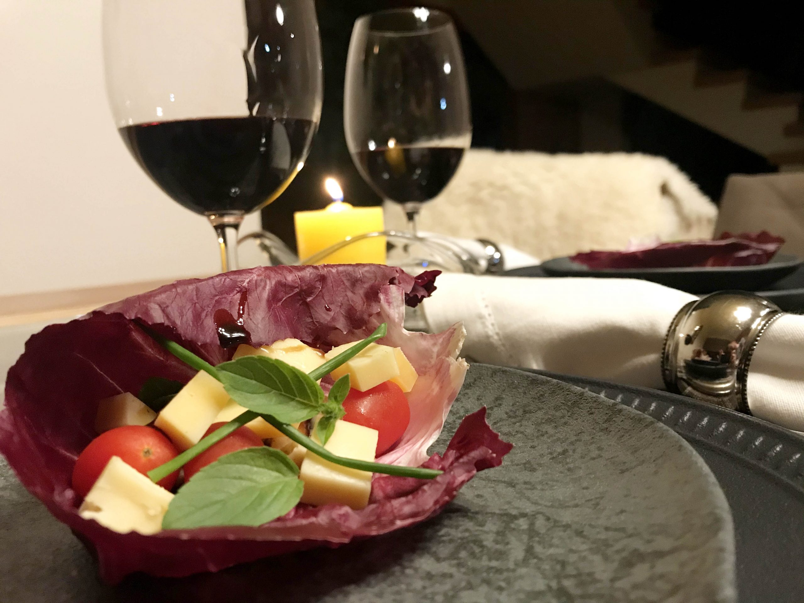 Preparo: tempere a folha de radicchio. Dentro dela, monte a salada alocando cada ingrediente com muito cuidado e atenção. Depois disso, salpique sal e gotas de balsâmico e oliva, e sirva como entrada. Fica uma delícia!