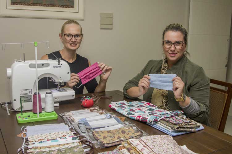 As amigas Lídia Gewehr e Aline Klamt trocam máscaras por alimentos para doação