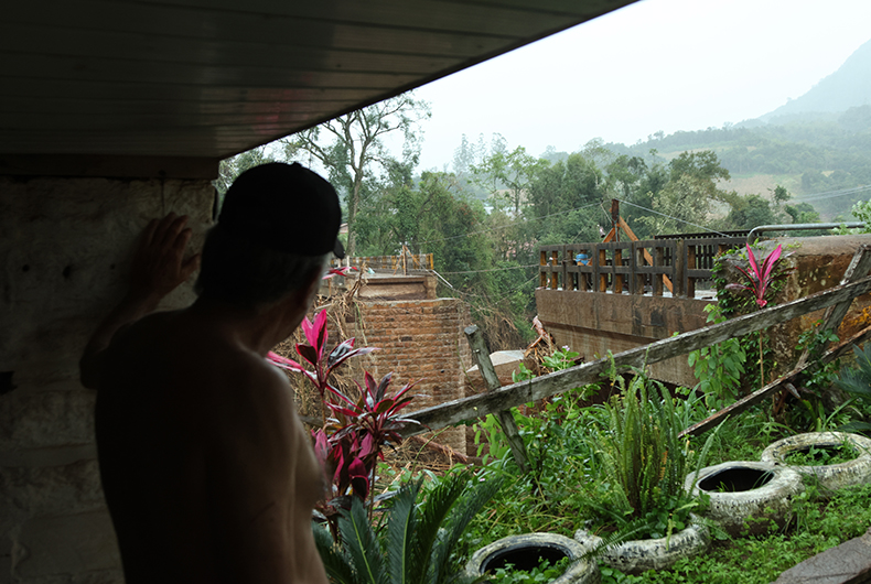 Essa “travessia” é possível por meio de um mecanismo com roldanas montado pelos moradores. Uns aguardam os envios enquanto Henckes auxilia para quem está à margem direita do rio. Do lado da ponte, uma garagem permaneceu erguida, com o pote de ração para cães abastecido. A casa onde moravam os donos dessa garagem já não existe, assim como a do vizinho, onde restou erguida apenas a escada de poucos degraus, construída em alvenaria. “O cara fica olhando e se perguntando: o que está acontecendo? A gente chegou a tremer de medo, porque vinha mais coisa ainda”, diz Raimbaldo Henckes.