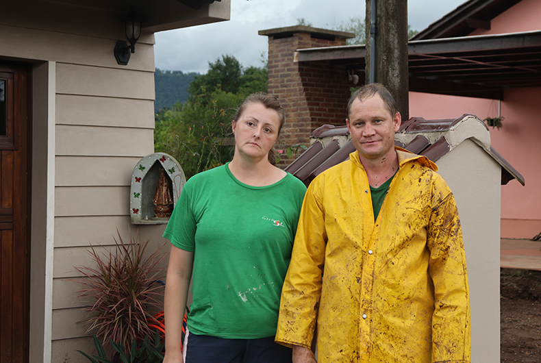 Na frente da residência do casal Rogério Luís Bressler e Rosana (foto abaixo), na Rua Pedro José Miguel Backes, uma gruta com Nossa Senhora Aparecida evidencia a fé da família. Depois da cheia no dia 30, ele ficou mais tranquilo porque o rio havia baixado, mas o início da tarde do dia 1o motivou a corrida para salvar alguns itens, como televisão e máquina de lavar, além do automóvel e do ônibus da Viação União Santa Cruz, onde trabalha. “Queremos que todo mundo fique bem e reconquiste seus bens. E não podemos perder a fé”, diz Bressler.