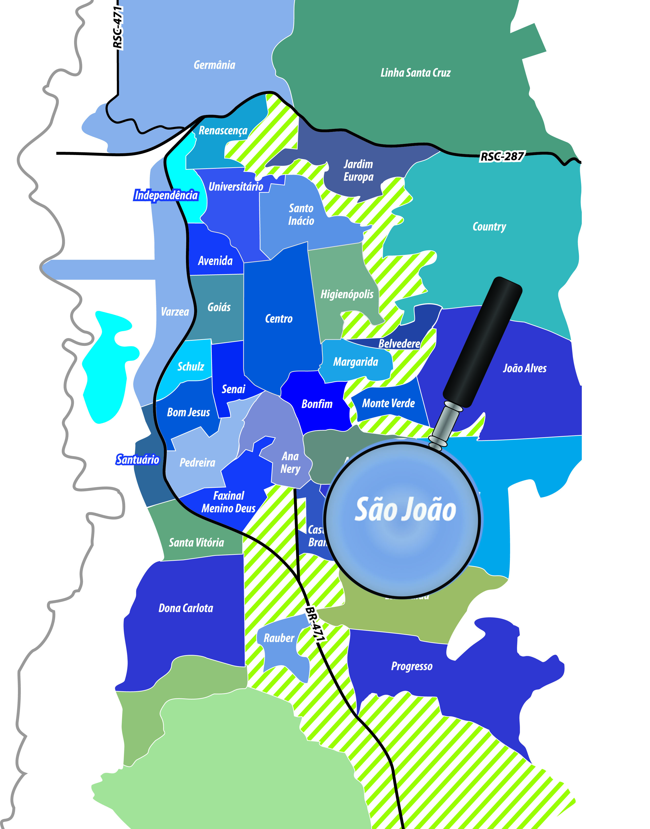 “Inicia em um ponto localizado no entroncamento do eixo da Rua Arnoldo Henrique Zimmer com o eixo da Rua Barão do Arroio Grande, seguindo pelo eixo desta, no sentido leste, até encontrar um ponto localizado no eixo da Rua Barão do Arroio Grande, alinhado com a divisa oeste do Loteamento Popular, seguindo por esta divisa, no sentido sul, passando pelos pontos localizados na divisa noroeste do Loteamento Popular, ao sul da Rua Pedro Kleudgen, e depois segue a leste até encontrar um ponto localizado na divisa sudeste do referido Loteamento, seguindo ainda no sentido sul, passando pelo ponto localizado no eixo do Corredor Frey e alinhado com a divisa oeste do Loteamento Popular, seguindo ainda a oeste com o mesmo alinhamento e sentido, até encontrar um ponto localizado no limite sudoeste do Loteamento Costa Sul, de onde segue, no sentido oeste, em linha reta, acompanhando o limite dos Loteamentos Costa Sul, Altos da Colina e São Luiz, passando pelos pontos localizados na divisa noroeste do Loteamento Borba, localizado no eixo da Rua Jônathas de Barros, alinhado com a divisa sudoeste do Loteamento São Luiz, e localizado no entroncamento das Ruas Jônathas de Barros e Agudo, seguindo por esta até encontrar um ponto localizado no eixo da Rua Agudo, no entroncamento com o eixo da Rua Arnoldo Henrique Zimmer, seguindo por este eixo, no sentido norte, até atingir o ponto inicial.” – Trecho da Lei Ordinária 8714, de 14/09/2021.
