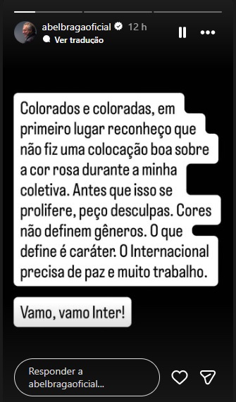 “Colorados e coloradas, em primeiro lugar reconheço que não fiz uma colocação boa sobre a cor rosa durante a minha coletiva. Antes que isso se prolifere, peço desculpas. Cores não definem gêneros. O que define é caráter. O Internacional precisa de paz e muito trabalho. Vamo, vamo Inter!”, escreveu no Instagram.