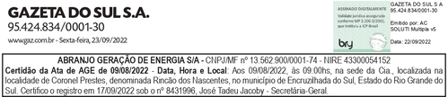Abranjo Geração de Energia S/A – Certidão da Ata de AGE – Publicidade Legal – Edição 23/09/2022