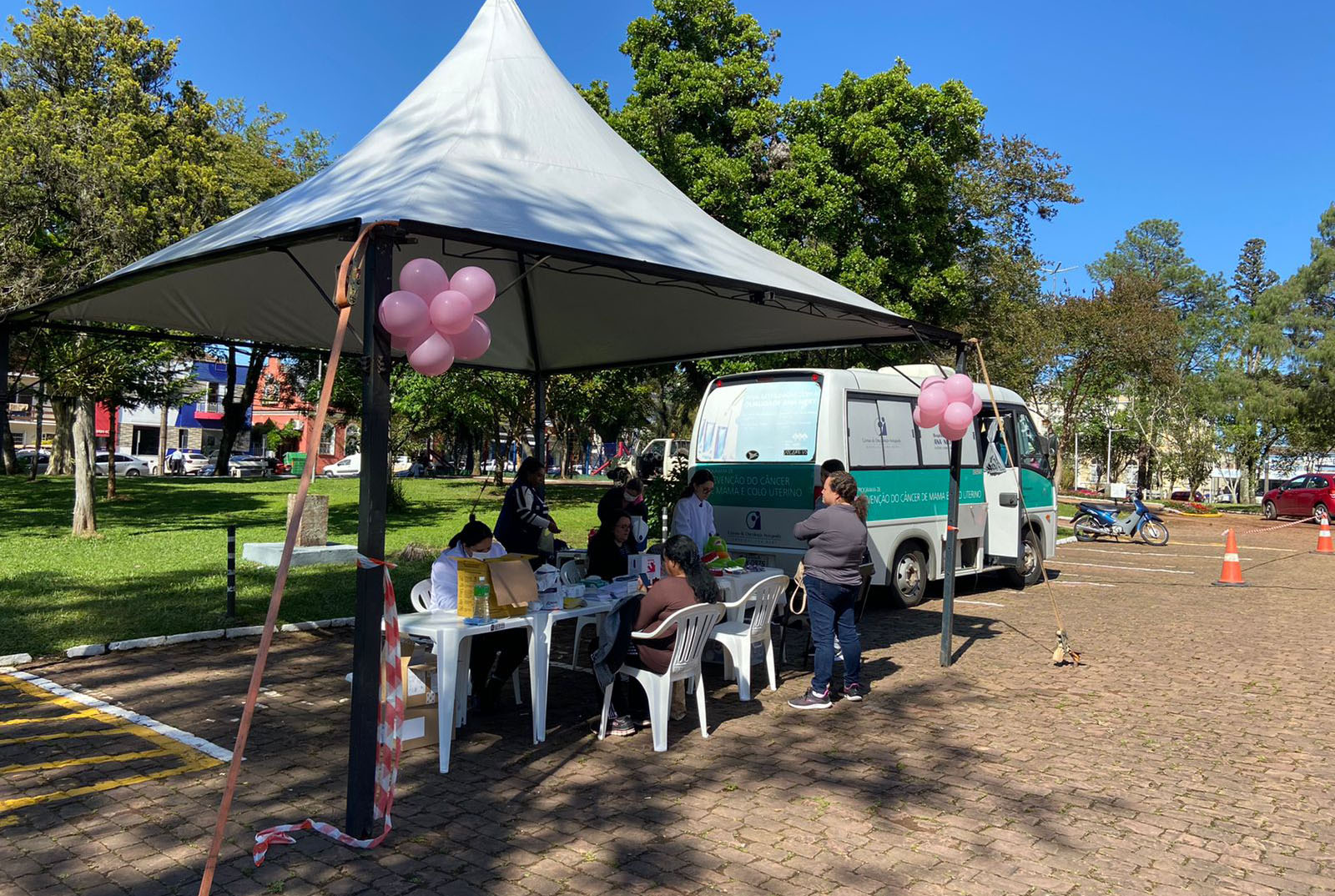 Uma ação da prefeitura de Santa Cruz do Sul, em parceria com o Hospital Ana Nery, oportuniza uma série de serviços nesta quinta-feira, 13, na Praça da Bandeira. A atividade é alusiva ao Outubro Rosa. Contando com uma unidade móvel de saúde, são oferecidos aos servidores municipais exames como pré-câncer e testes rápidos para doenças sexualmente transmissíveis, como HIV, sífilis, hepatite. São ofertadas também, vacinas da Covid-19, pólio, influenza e orientações na área da saúde odontológica.