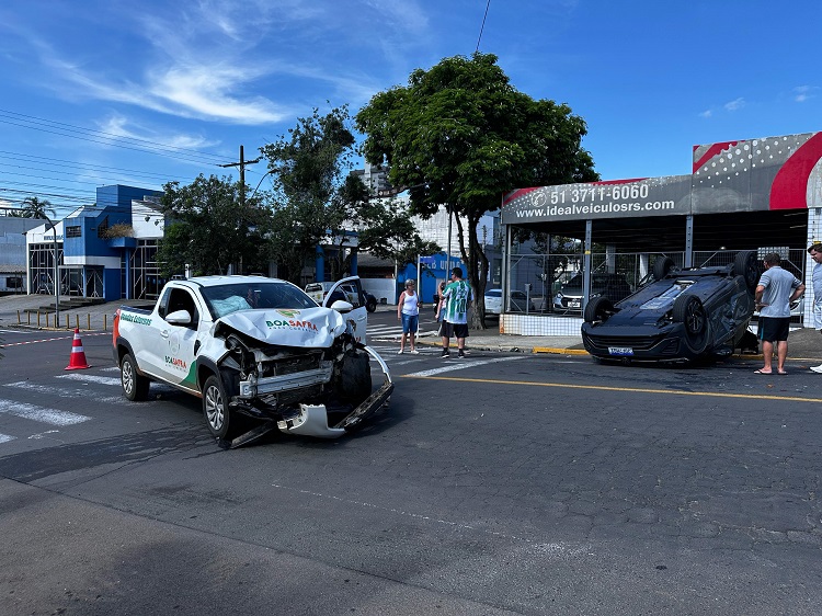A colisão, no início da tarde, deixou um dos automóveis, um Volkswagen Nivus, capotado em frente a uma revendedora de veículos, invadindo a calçada. O outro veículo teve a frente destruída e ficou no meio da rua.