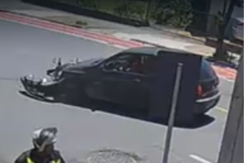 Um acidente foi registrado no final da manhã de terça-feira, 18, na Avenida Paul Haris, em Santa Cruz do Sul. A colisão envolveu um automóvel Celta, de cor preta, com placas de Rio Pardo e uma motocicleta Honda Fan 150, de cor vermelha. Imagens de câmeras de segurança mostram o momento do acidente.