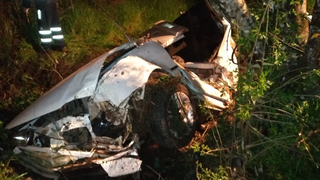 Caminhonete Saveiro bateu contra uma árvote após sair da rodovia. As causas da tragédia ainda são investigadas pela polícia