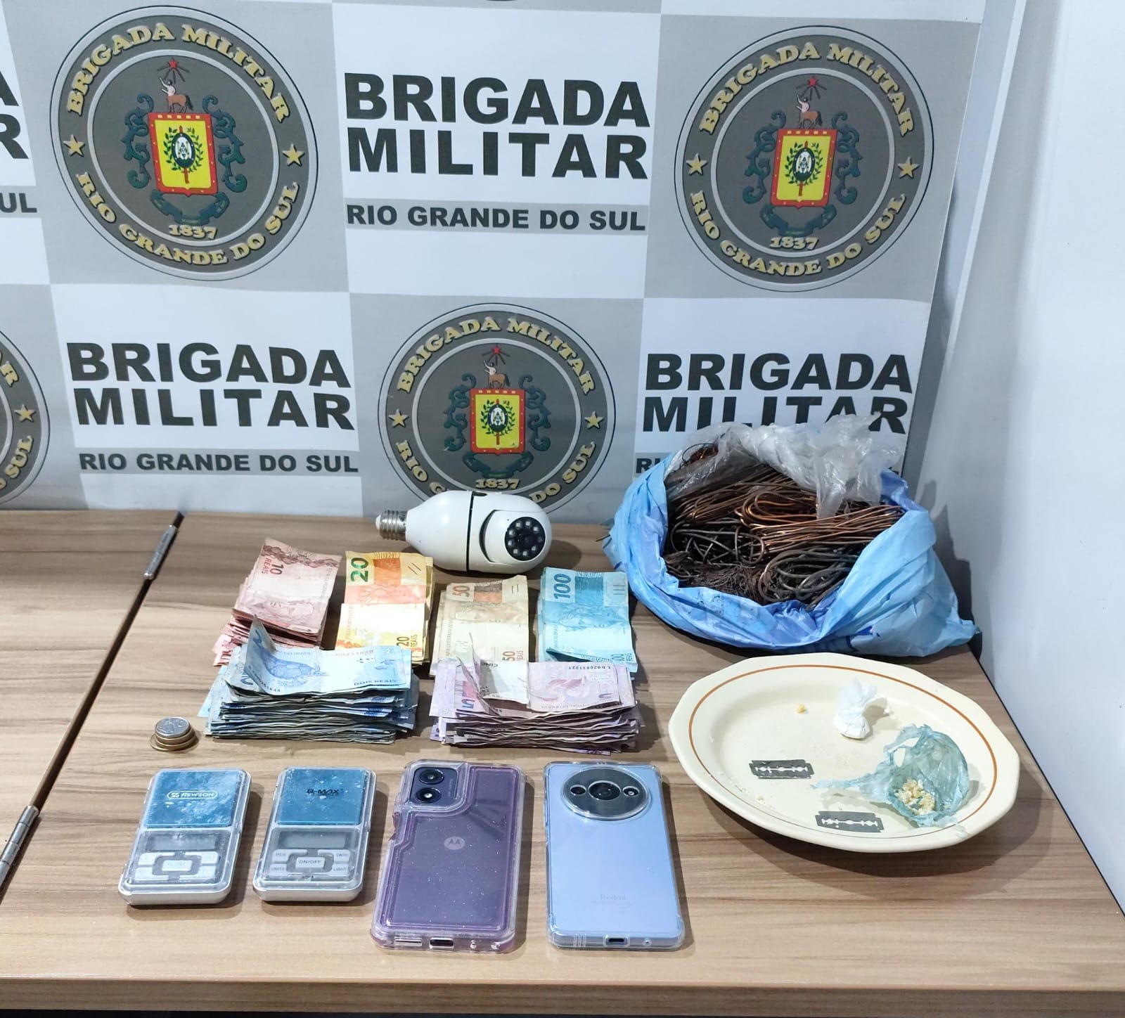Por fim, cerca de meia hora depois, um homem de 42 anos foi detido por tráfico no Bairro Gressler, no âmbito da Operação Cerco Fechado Intensificação. Ele foi flagrado entregando drogas a um outro indivíduo, de 33, com o qual havia uma porção de crack. No local, os policiais militares ainda encontraram outros itens ligados à atividade ilícita, como balanças, um prato com resquícios de crack, dois giletes, uma câmera de monitoramento e dois celulares, além de uma sacola de 2,5 quilos de fios e cabos de suposta origem ilícita e R$ 1.445,00 em dinheiro. O homem de 42 anos foi preso em flagrante, enquanto o outro foi levado à delegacia por posse de entorpecentes.