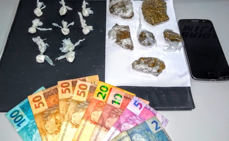 Foram encontradas com ele oito porções de cocaína pesando 6,8 gramas, seis invólucros de maconha pesando 81,50 gramas, R$ 287,00 e um aparelho celular. O indivíduo foi encaminhado à delegacia para a lavratura do flagrante. O usuário conseguiu fugir.