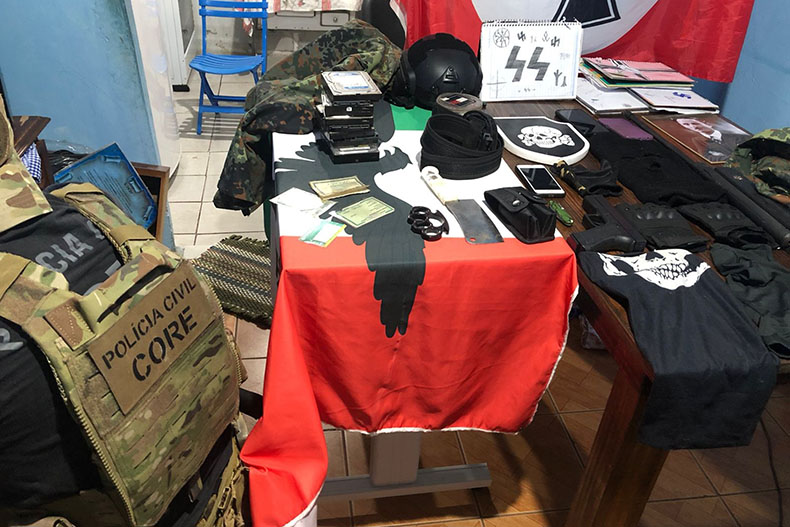 No local, foram encontradas bandeiras e fotos nazistas e fascistas, imagens de Adolf Hitler e Benito Mussolini, simulacro de arma de fogo, facas, canivetes, fardas camufladas e capacetes. Por conta da grande quantidade de materiais encontrados, os pais do adolescente foram presos por apologia ao nazismo. Os materiais serão encaminhados para a perícia.
