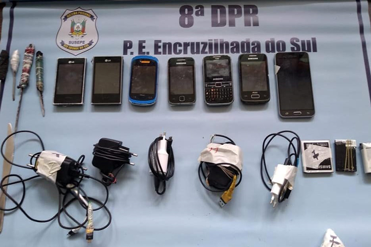 A fiscalização, de rotina, também recolheu materiais proibidos na unidade prisional, tais como sete aparelhos celulares e acessórios, quatro facas artesanais (estoques) e uma porção de substância semelhante à maconha.