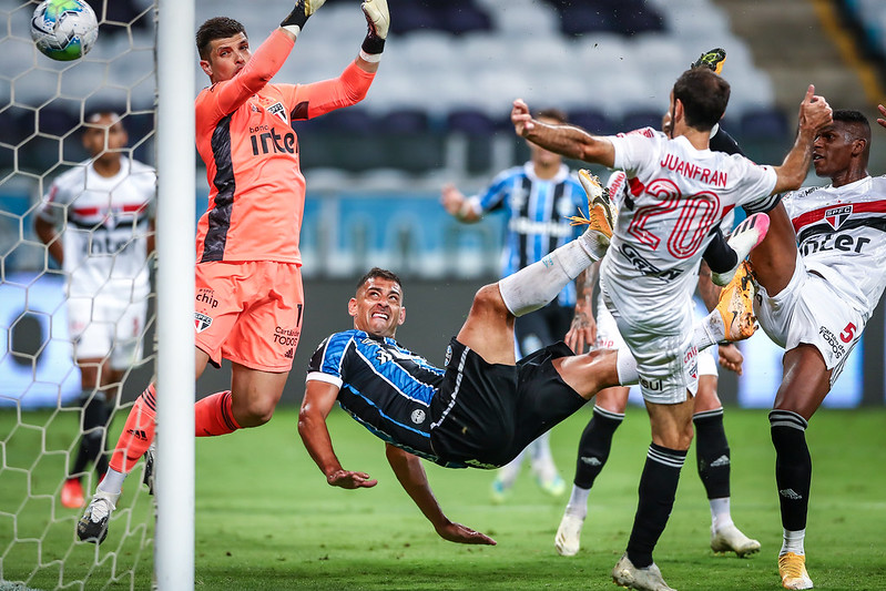 Aos 14, Pepê chegou com perigo ao receber passe em profundidade. O goleiro do São Paulo se antecipou para cortar o ataque gremista.
