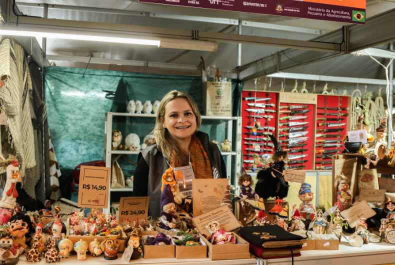 Com seis participações na Expointer, a artesã Raquel Ellwanger, de Candelária, costuma dividir o estande com a mãe, Suzana Pfeiffer. Elas trabalham com artesanatos em fibras vegetais, além de fadas, duendes e outras figuras místicas. Segundo Raquel, os preparativos começaram há pelo menos três meses com o objetivo de garantir estoque suficiente para comercializar durante os nove dias da feira. “Neste ano, vamos investir muito na decoração do estande para ter um diferencial e chamar a atenção das pessoas”, ressalta.