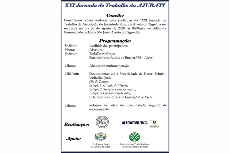A Ajurati promove nesta sexta-feira, 30, a 21ª Jornada de Trabalho no salão da comunidade de Linha São José, com início ás 8h30. O evento conta com apoio e participação da Emater/RS- Ascar. O objetivo deste evento é trazer novas lideranças e incentivar a permanência do jovem no campo.