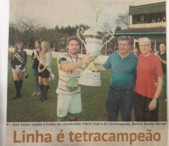 Alex Keller – O primeiro título veio nas categorias iniciais, em Venâncio Aires, o ano não me recordo ao certo, mas foi no início dos anos 1990. Na ocasião joguei pelo Santa Tecla, dei a sorte de fazer o gol do título, acabei sendo escolhido craque da competição, e com isso surgiram boatos de que teria um “olheiro” de Venâncio interessado em me levar ao Internacional para fazer testes. Nesta final tive o prazer de conhecer um amigo, que jogou contra, pela equipe do Cruzeiro, um amigo que admiro e respeito muito, Cristiano Flores de Medeiros, conhecido como Medeiros, e por ironia do destino, ambos em final de carreira, vamos nos enfrentar nesta final de Monte Alverne pelos Aspirantes, eu pelo São José e ele pelo Aliança, e depois, como fazemos parte do veterano do Linha Santa Cruz, continuaremos jogando juntos nos finais de semana, até sabe-se lá quando.