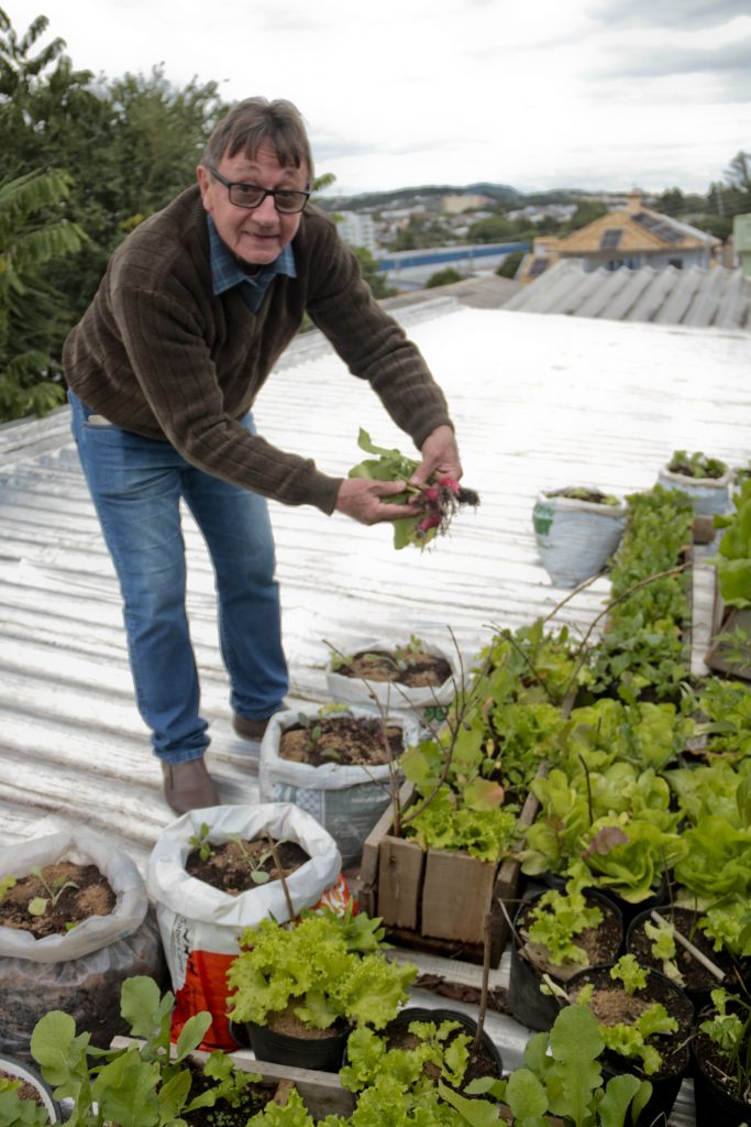 Um desses costumes é a inusitada horta no telhado, da qual cuida com esmero. “A principal ideia é mostrar que não precisa ter um terreno para plantar, é só querer”, relata. A casa do Bairro Ana Nery é grande, mas com pouco espaço térreo para o cultivo de verduras, legumes e frutas. “Eu tive quatro tipos de câncer pra curar, então, me ocupava em casa cuidando das minhas plantas, para não ficar sem fazer nada. Desde jovem, quem fazia horta era eu, e assim continuo fazendo.”