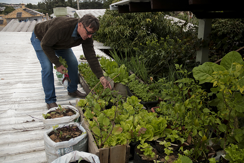 Sem espaço no terreno, o telhado da casa se transformou em local de cultivo de variedades como alface, rabanete, rúcula e cebolinha, entre tantas outras opções de alimento natural e orgânico. E na casa de Willborn, tudo é reaproveitado. Resíduos orgânicos, como cascas e folhas, vão para a composteira e se transformam em adubo.